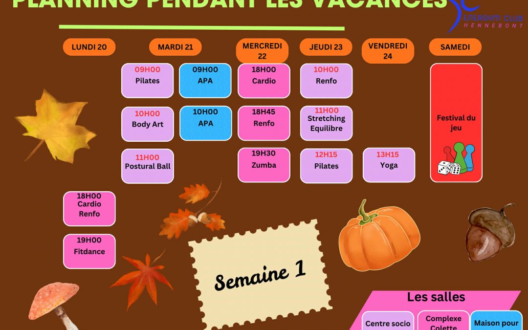 planning vacances Toussaint 2025 semaine 1 par Energym Hennebont | Oct 11, 2025 Planning des cours de la première semaine des vacances de la Toussaint : tous les cours sauf ceux de Joëlle et du samedi.